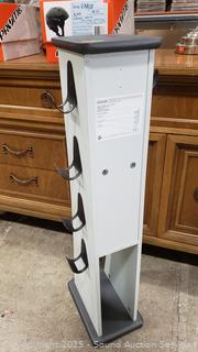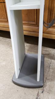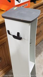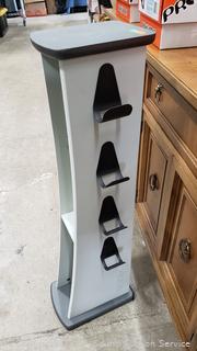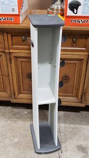 Missing a shelf to hold games. Space in the bottom to hold a console and controller hangers on the sides. 36" H x 6.5" W x 8.25" D.