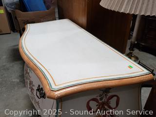 All wood construction. Deep drawers. Some scuffs, wear to finish. 34" H x 38" W x 20" D.