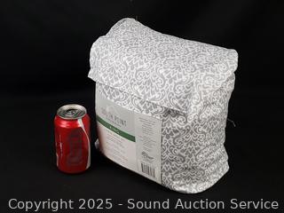1 flat, 1 fitted, 4 pillowcases. Damask gray print.