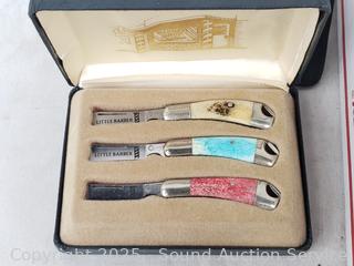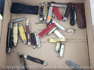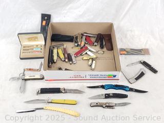 Some brands include Western, Hubectus, Imperial, Victorinox, Case, Gerber, Baker, Hammer, Little Barber knives set, Camillus etc. Refer to photos for lot contents, more details.