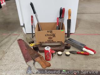 323 Lots including Gun Safe, Tables & Chairs, Cherry Queen Sleigh Bed, Twin Bed, 15ft Chair Stair Lift, Lawn & Garden Tools, Assorted Kitchen Cutlery, Tons of Various Tools (Hand Saws, Files, Chisels, Braces, Clamps. Etc), Woven Baskets, Military Buttons, Scissors, Footwear, Bedding, Planter Pots, Bookshelves, Household Goods & More!!!