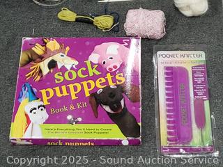 Yarn, sock puppet kit, pocket knitter, glue gun, scissors, etc. Refer to photos for lot contents, more details.