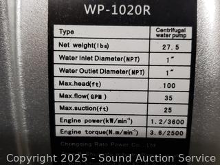 Motor model WP-1020R. 1" intake/outtake, 35 GPM. 79CC engine. Could not get started, may need water to function, started for a second with starting fluid then died.