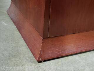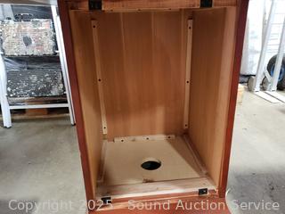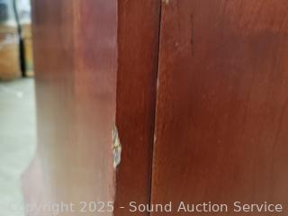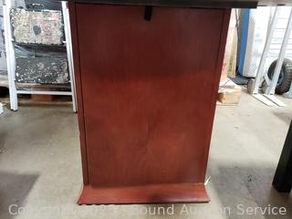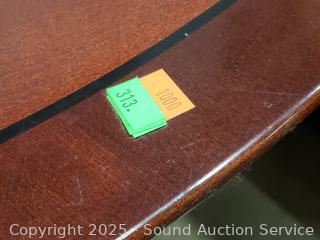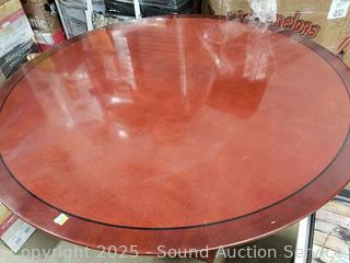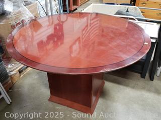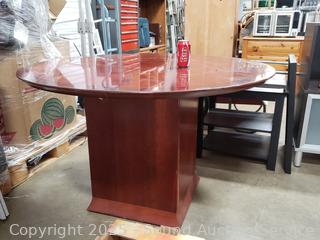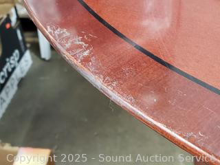 Hidden storage in the base. Has some old tape residue on edge of tabletop. Overall good condition. 29.5" H x 48" Dia.