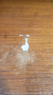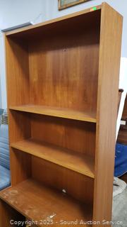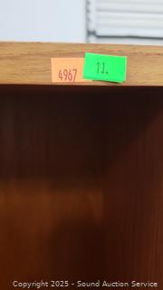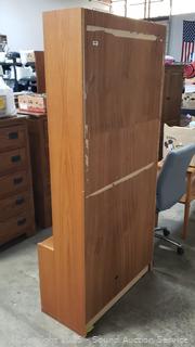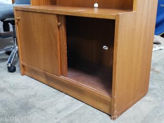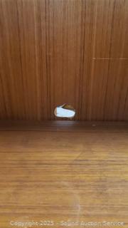 Some scuffs, wear to finish. Particle board construction, teak veneer. 75" H x 35.5" W x 15.75" D.