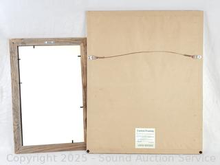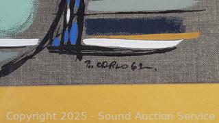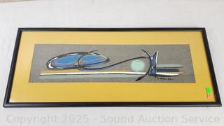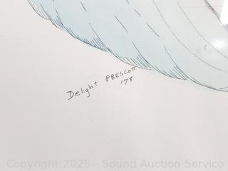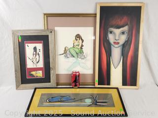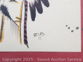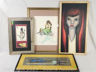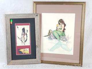 Signed Abstract Batik, 10.5" x 24.75". Bird signed Native art, 17-3/8" x 11.5". Ropp '62 signed original portrait, 24.5" x 13". Delight Prescott '78 signed Mermaid art, 17.5" x 21.5".