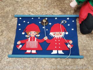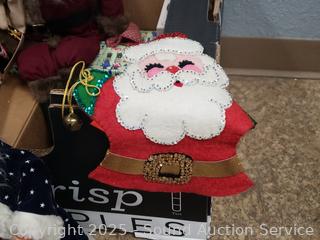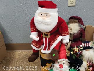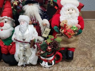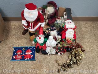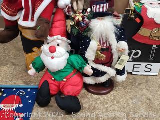 Santa dolls, figures, snow globe, porcelain village figure, etc. Refer to photos for lot contents, more details.