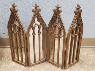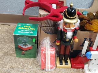 3pc Mirrored Cathedral, Nutcracker, electric candelabra, scented candle, figures, various other decor.