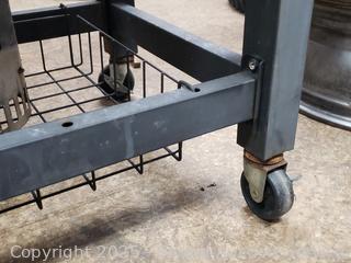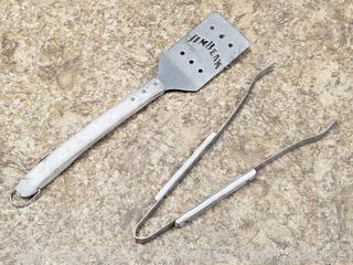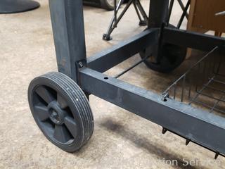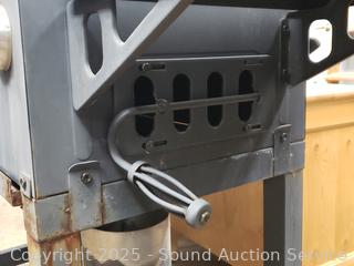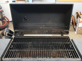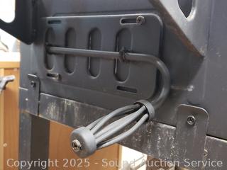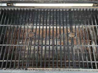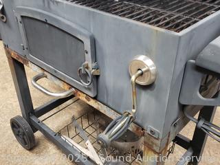 Various weathering, wear from use. 46" H x 61" W x 18.5" D. Comes with a coal starting chimney, Jim Beam spatula & tongs.