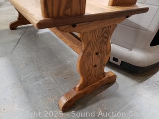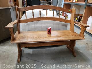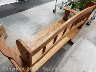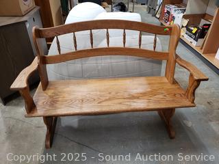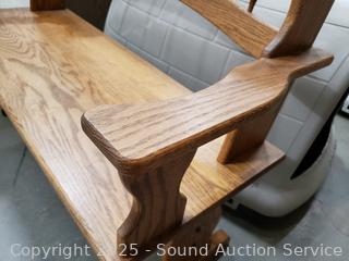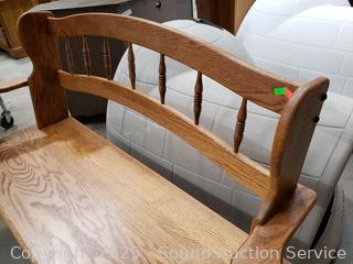 All wood construction. Don't see any issues. 35" H x 47" W x 17" to seat.