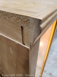 2 adjustable glass shelves. Beveled glass door. 49.5" H x 19.5" W x 12.5" D.