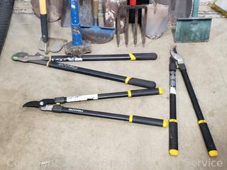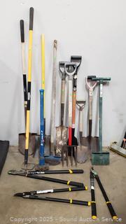 Spade shovels, flat shovel, loppers, edgers, sledgehammer, etc. Refer to photos for lot contents, more details.