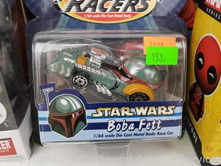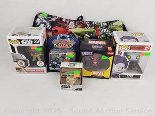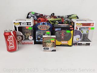 Marvel Daredevil Dirbz vinyl figure, Marvel Avengers Backpack Funko Pop! #231 Star Wars Young Anakin Skywalker, Funko Pop! #217 Deathnote Ryuk, Disney Racers Boba Fett, Star Wars Mandalorian Grogu. Don't see any issues.