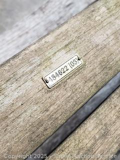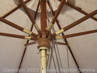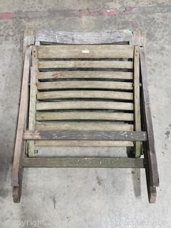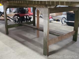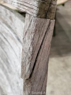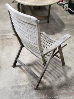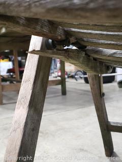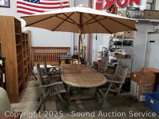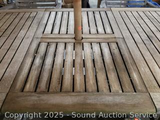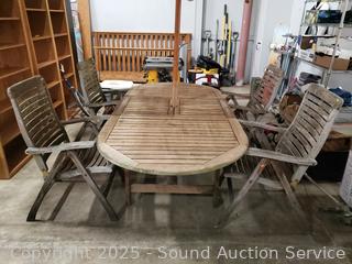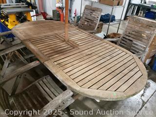 Lot #0013: Weathered Teak? Patio Table w/4 Folding Chairs & Umbrella