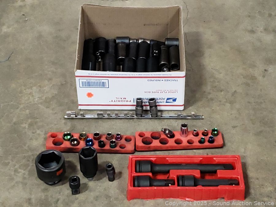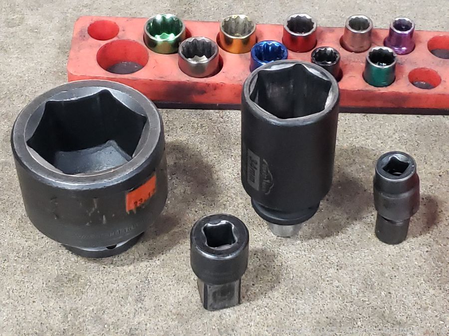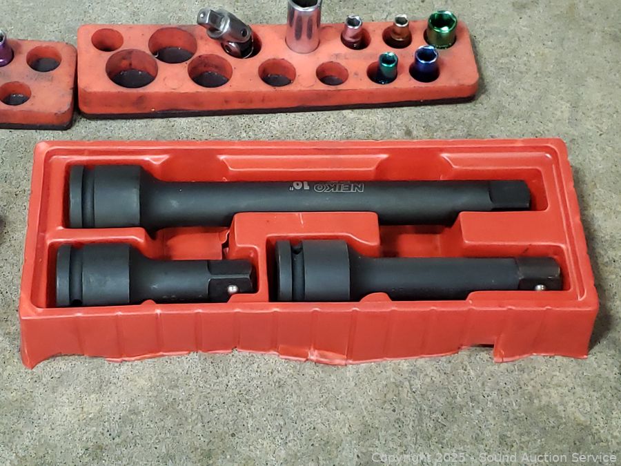 Some brands include Wright, Gorilla, Neiko, Seket Max. 3/4" extenders, approx. 1/4" to 2", 1/4", 3/8", 1/2", 3/4" drives. Some swivels.