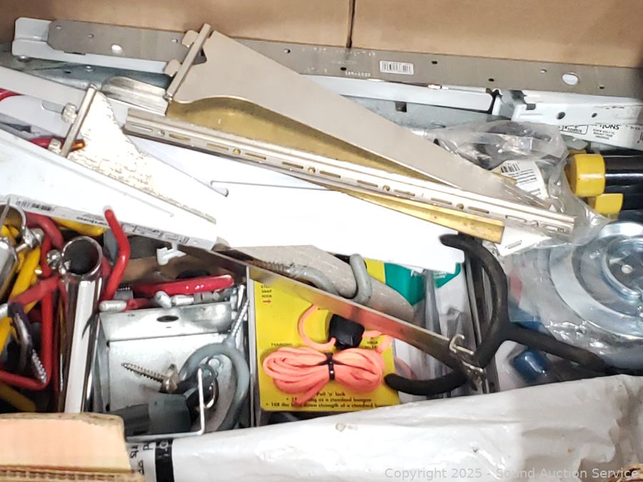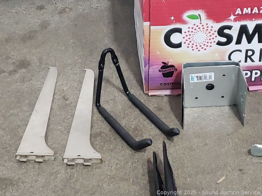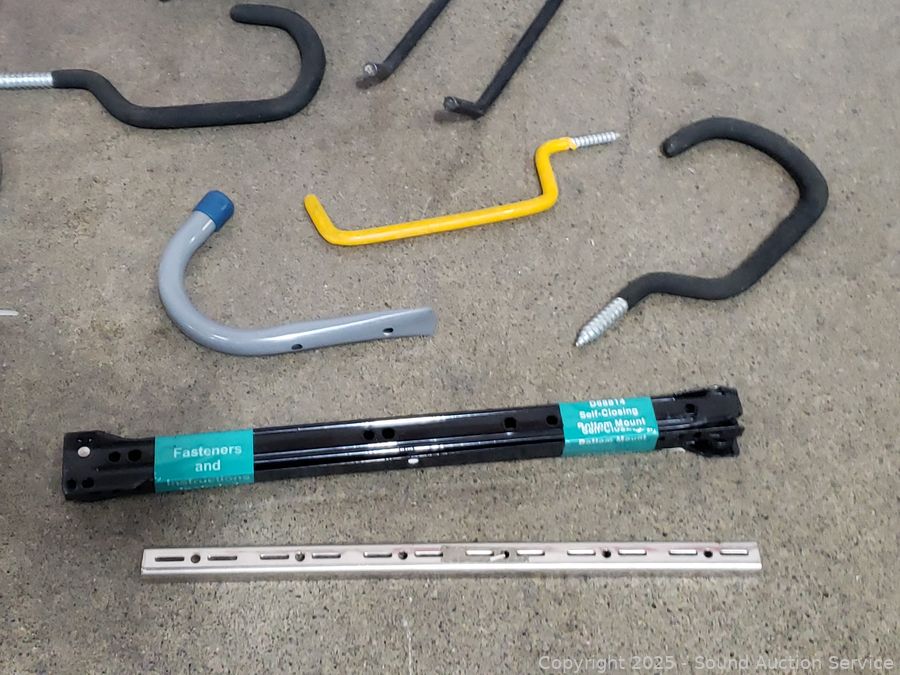 Slot shelf brackets, large screw hooks, other brackets & hangers, etc. Refer to photos for lot contents, more details.