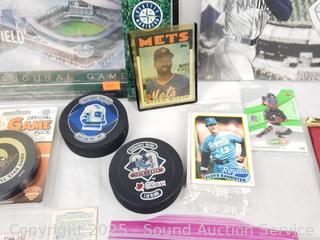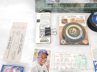 Hockey pucks, trading cards, tickets, patches, etc.