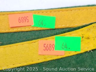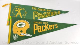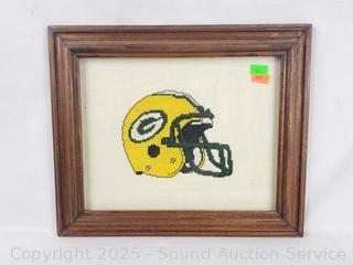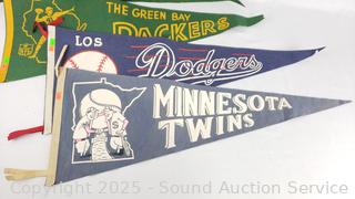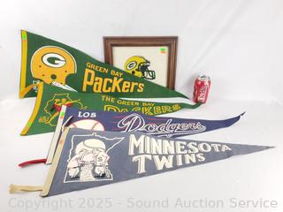 Lot #0064: 4 Vintage Sports Pennants & Green Bay Packers Needlepoint Artwork