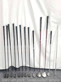 13 various clubs, most are DDT Titanium, Trident #3 14° driver, Trident #1 9.5° driver, 3|4|5|6|7|8|9 irons, Pitching wedge. Various wear from use. Refer to photos for more details.