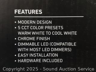 Integrated LED's, 2500LM, 2700-5000K color. 3.2" x 14.9" Dia. Appears to be functioning as intended. Don't see any issues.