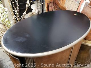 Light wear to finish. Don't see any major issues. Sides, front adorned with crocodile leather. 35" H x 31" W x 19.5" D.