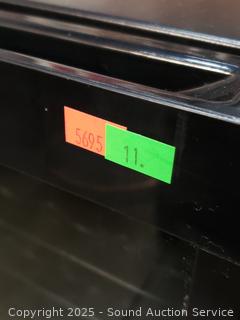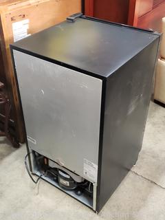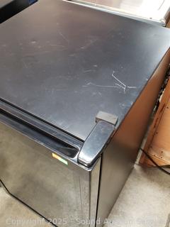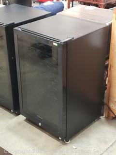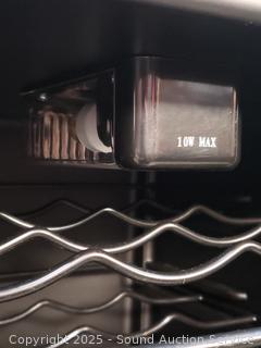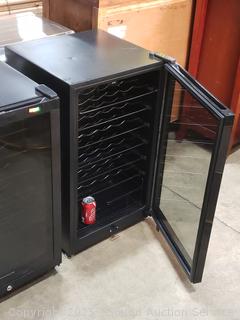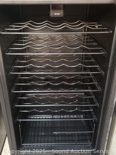 Appears to be functioning as intended. Looks to hold at least 30 bottles of wine. 30.5" H x 19.5" W x 20.5" D. Some scuffs, wear to finish.