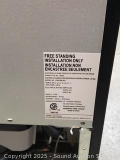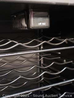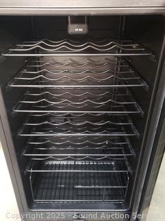 Appears to be functioning as intended. Looks to hold at least 30 bottles of wine. 30.5" H x 19.5" W x 20.5" D. Some scuffs, wear to finish.