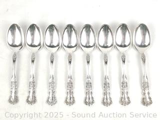 TW: not including butter knives or cake knife 27.6oz = 780g. 8 sm. forks 10.1oz = 284g, 8 spoons 7.7oz = 218g, 8 lg. forks 8.7oz = 246g, 1 spreader 1.1oz = 32g, 10 butter knives & 1 cake spreader, did not weight, a lot of non-sterling weight.