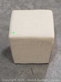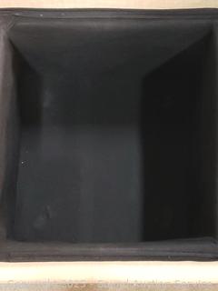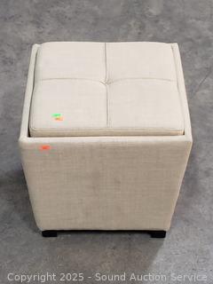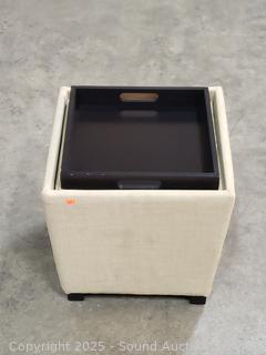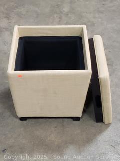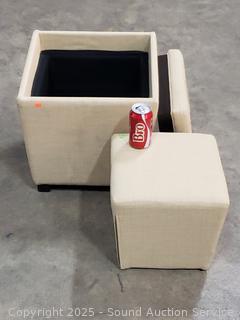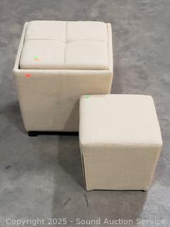 Smaller one fits into the larger one. Large one has a flip top to double as a table. 12" x 12" x 12 & 17" H x 16" x 16".