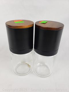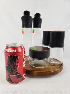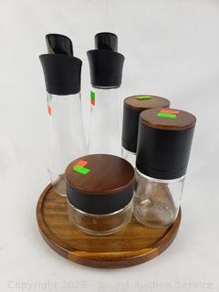 2 Cruets, salt & pepper mills, sugar jar, lazy Suzan. Signs of use, could use a proper cleaning.