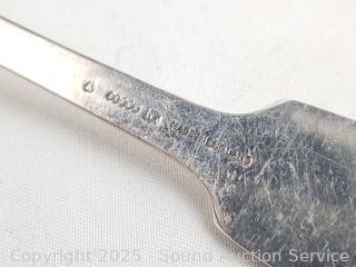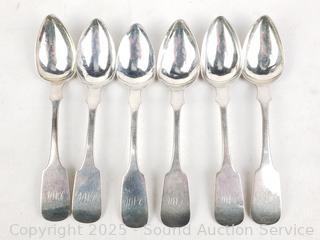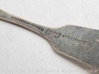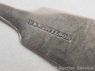 (1) Willard Hawley, (1) Dixon made in England, (1) unmarked, (6) R&W Wilson. Non have sterling marks, all tested high silver content on acid test. TW: 7.9oz = 224g. Comes with silvercloth.