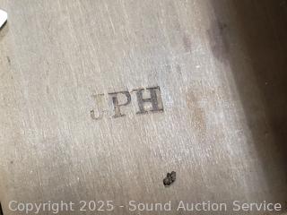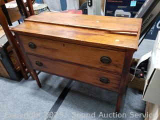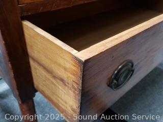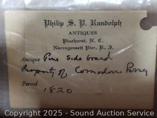 Comes with antique dealers card, reads "Property of Commodore Perry 1820". Family lore is that this was the Commodore Perry who forced Japan to open its door to trade, but no way to confirm. Could also be his brothers who was also a Commodore but died in 1819. 29.75" H x 38.5" W x 18" D. Backsplash is not attached, right edge has a broken piece, comes with piece.
