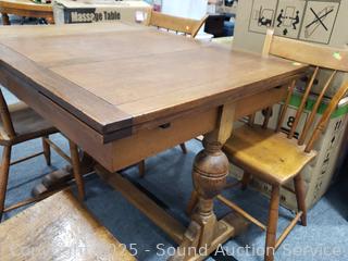 30" H x 35" x 35" with (2) pullout 11.5" leaves. Olde patina finish.