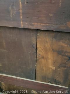 Skeleton key locks, NO key. Olde patina finish. Old brass, missing one of the pull handles. All wood construction. Large chip on front left leg. 54" H x 27" W x 19.25" D.