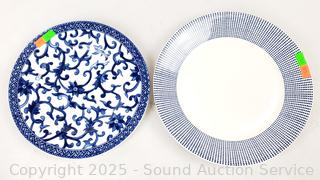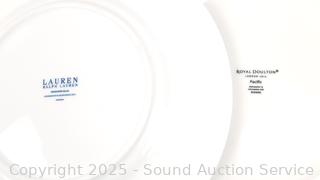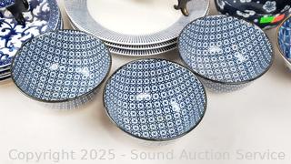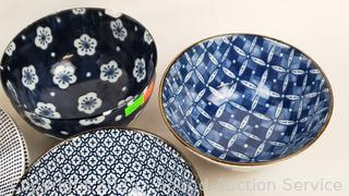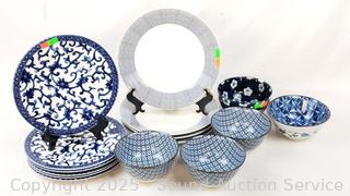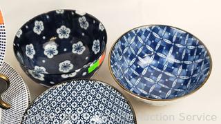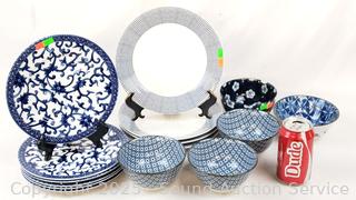 5 Japanese bowls (one is chipped), 6 Ralph Lauren salad plates, 4 Royal Doulton "Pacific" plates.