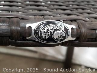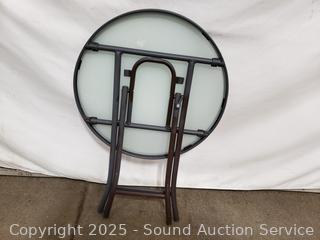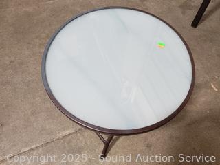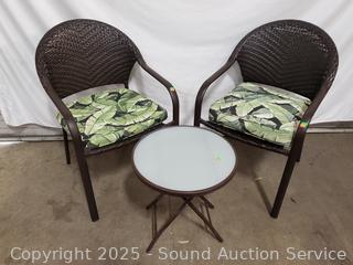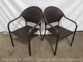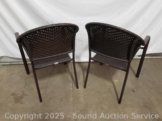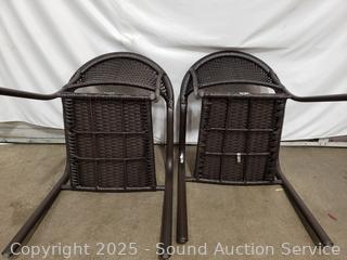 Lot #0024: 2 Metal Bronze Finish Rattan Woven Patio Chairs & Folding Side Table