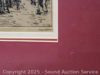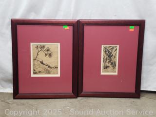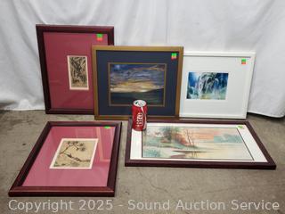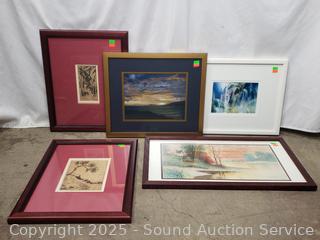 Refer to photos for lot contents, more details. 12" x 15" to 21" x 11". One with trees has damaged matting, some scuffs, on frames.