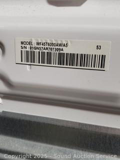 Model WF45T6000AW/A5, Serial 01GN57AR707309A. Pulled from the home working. Light wear from use, overall great condition. 38.5" H x 27" W x 28" D. Matches the next lot.