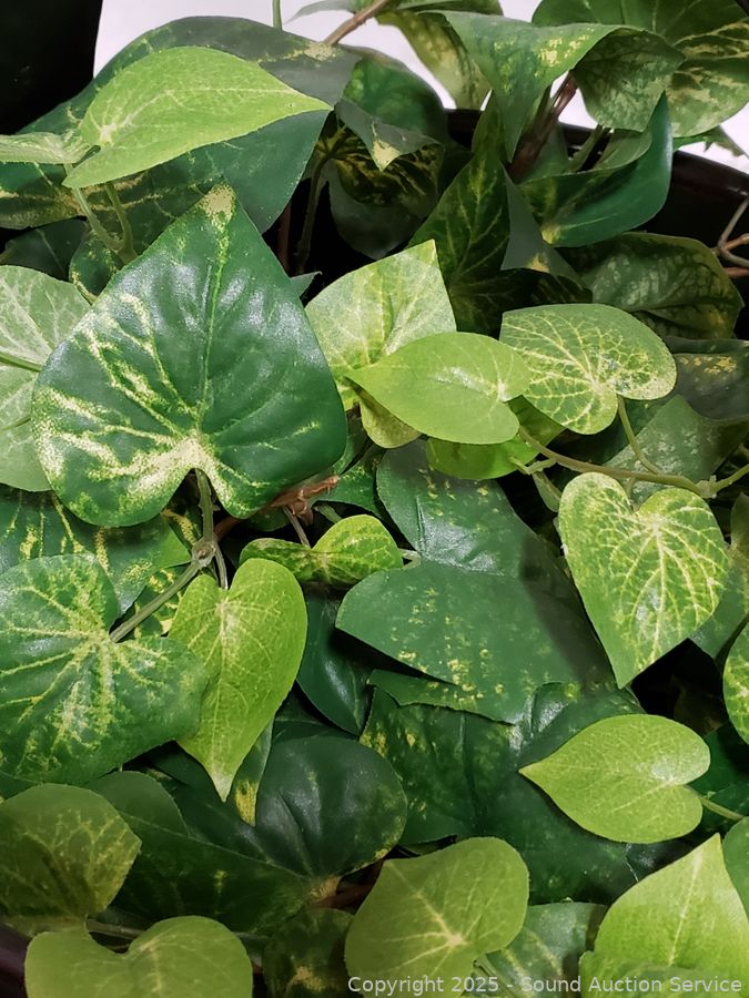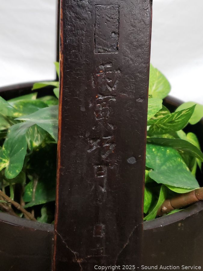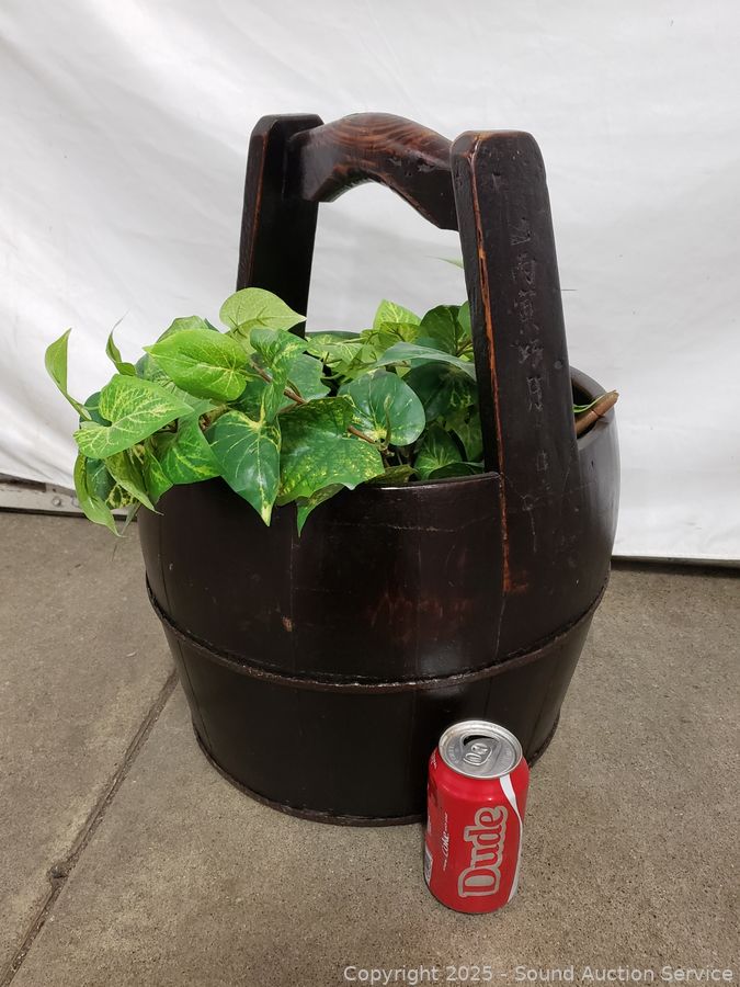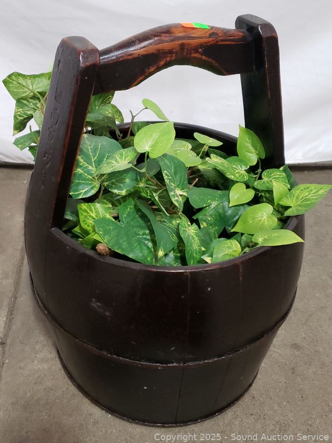 Lot #0036: Vintage Asian Wood Pail w/Faux Ivy Plant