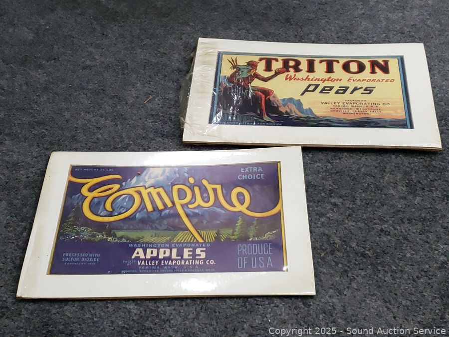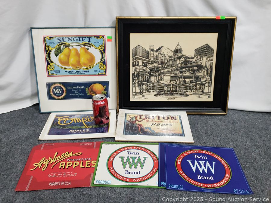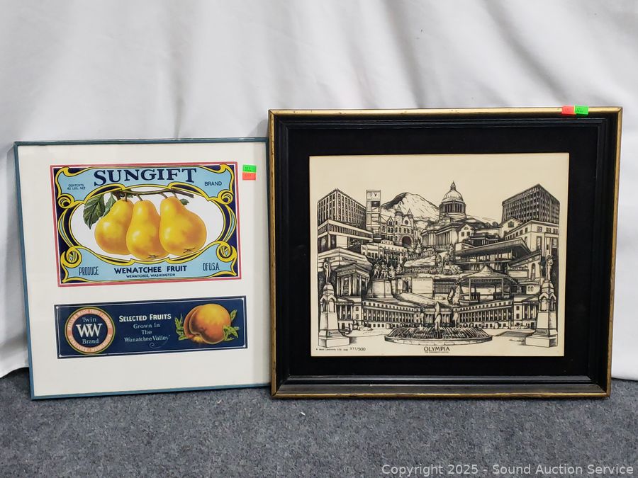 Lot #0323: Fruit Advertisements Prints & Scrimshaw Olympia Plaque