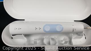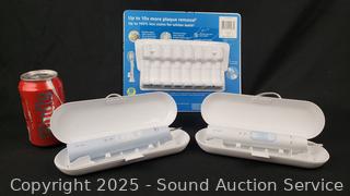 Both appear to be functioning as intended. Comes with 2 handles, 2 chargers, 2 cases, 6 brush heads. Some wear, dirty spots from use.