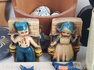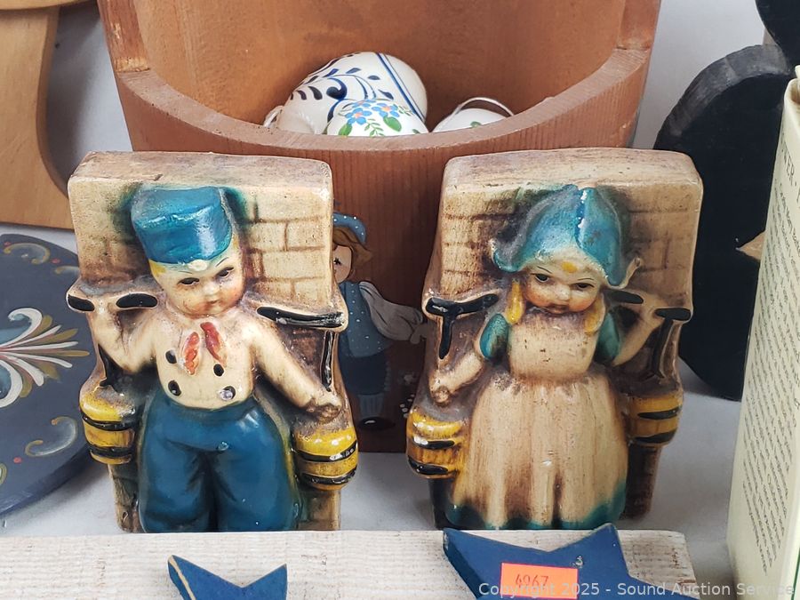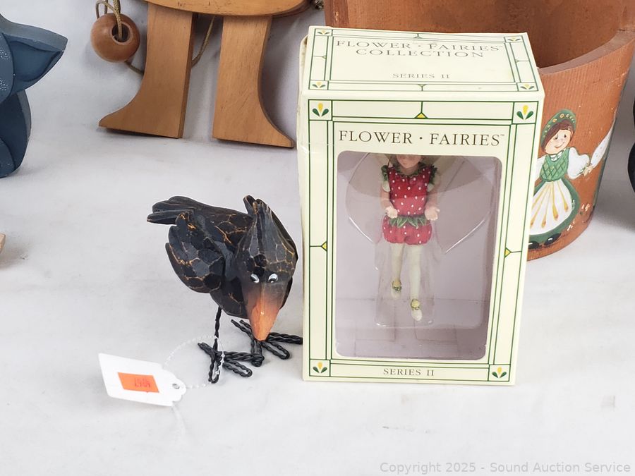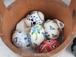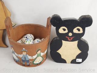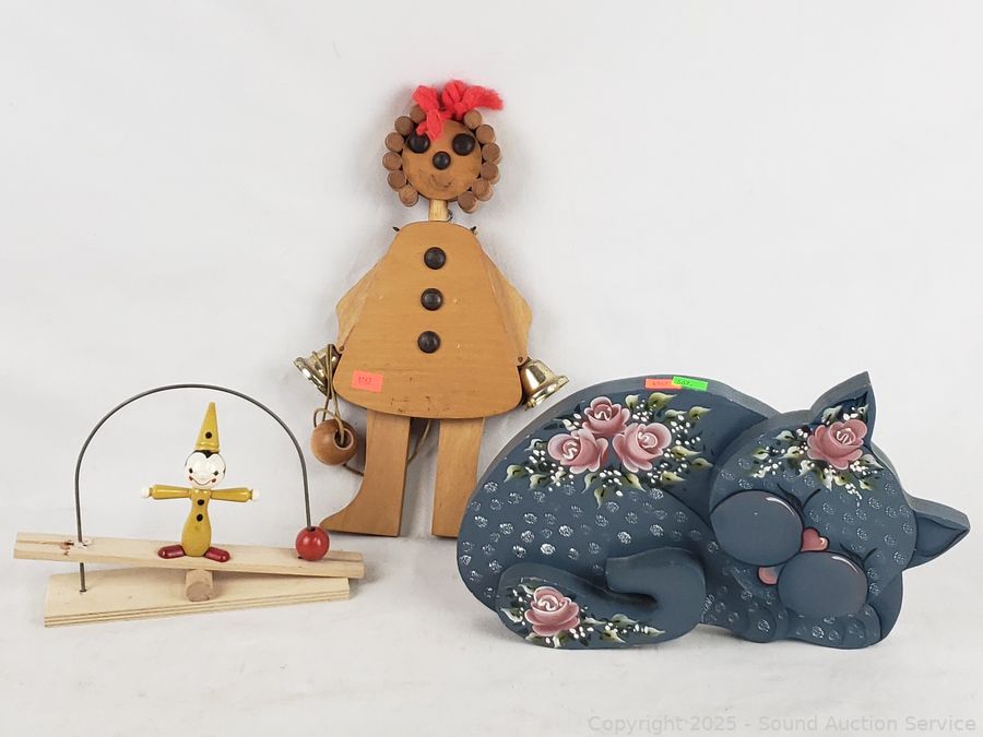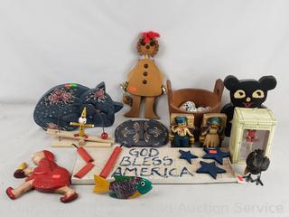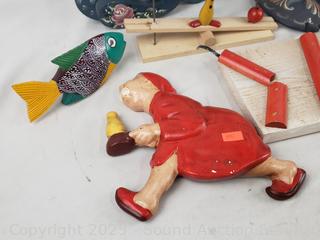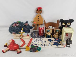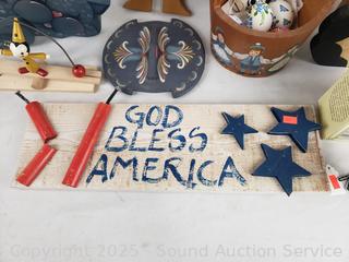 Hand painted eggs, wood animated Raggedy Anne bell, carved wood fish, painted wood decor & more. Refer to photos for lot contents, more details.