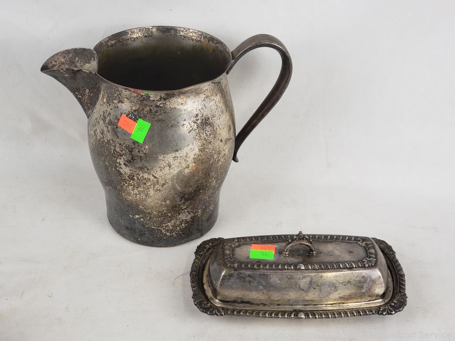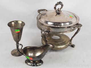 Chaffing dish, butter dish, pitcher, gravy boat, trays, dishes, etc.