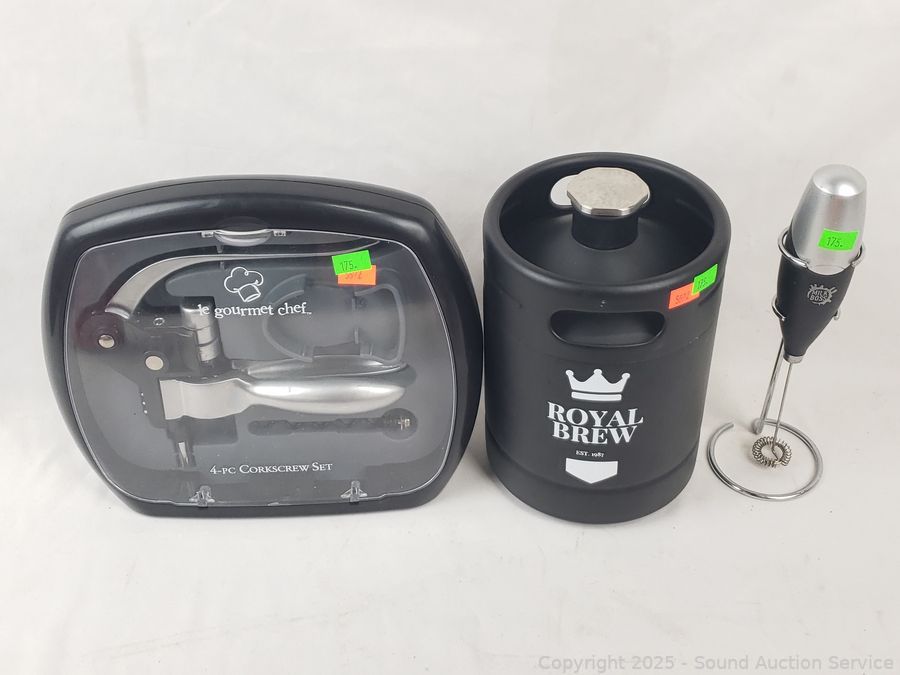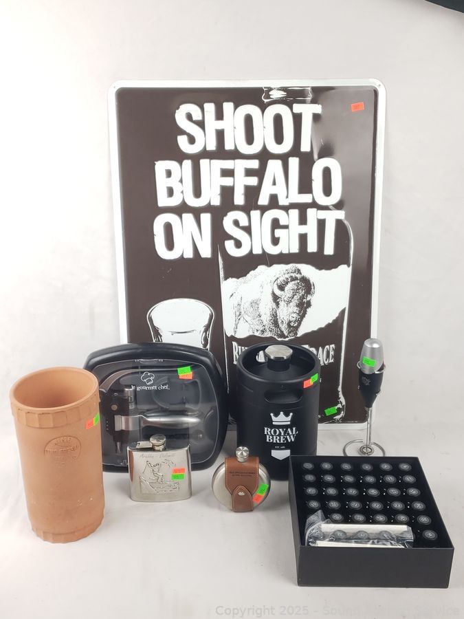 Assorted Drinkware - Flasks, tin sign, mixer, corkscrew set, Nosing Sample kit, Royal brew keg, terracotta utensil jar, etc. Refer to photos for lot contents, more details.
