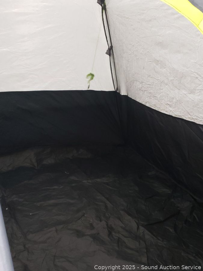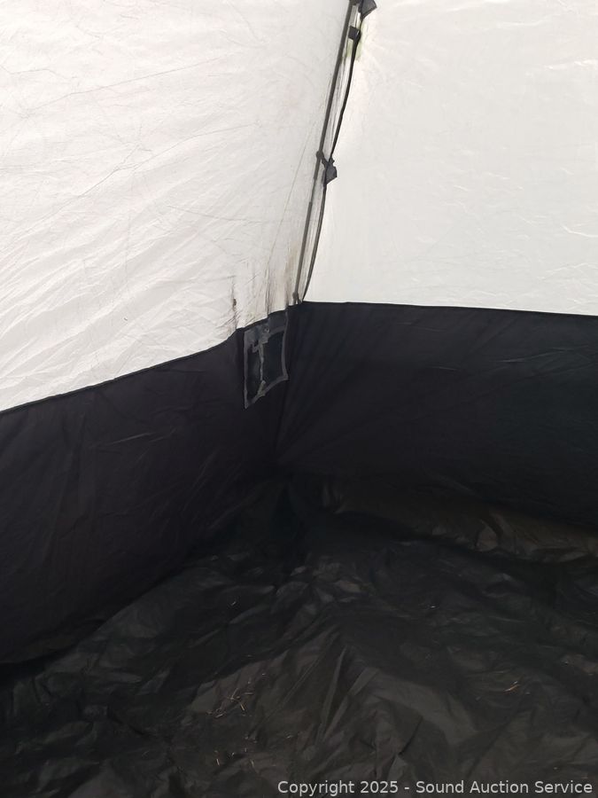5.5ft x 9ft x 10ft. Some dirty spots, wear from use, light has power, but doesn't stay on. Only 3 stakes.