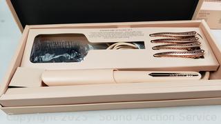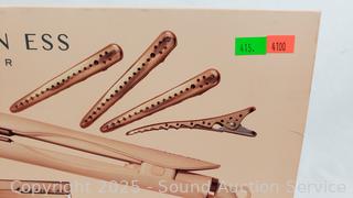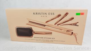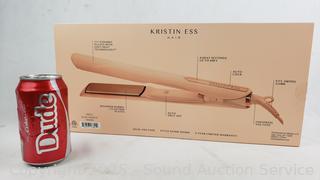 Has some scuffs, wear from use. Appears to be functioning as intended. Comes with 3-in-1 ceramic flat iron, detangling brush & 4 sectioning clips.