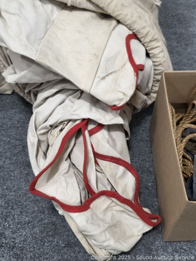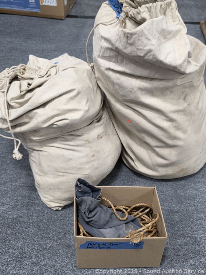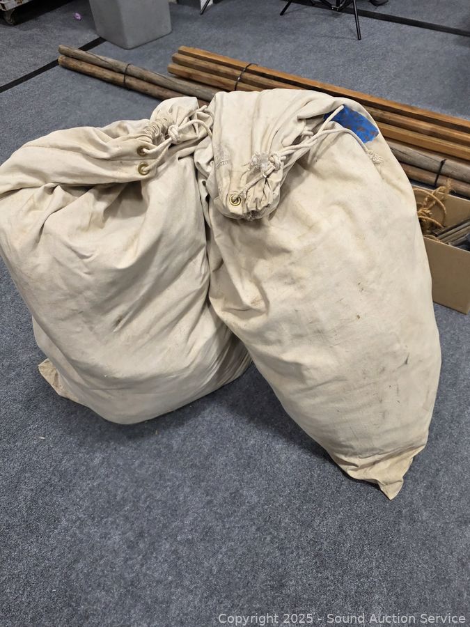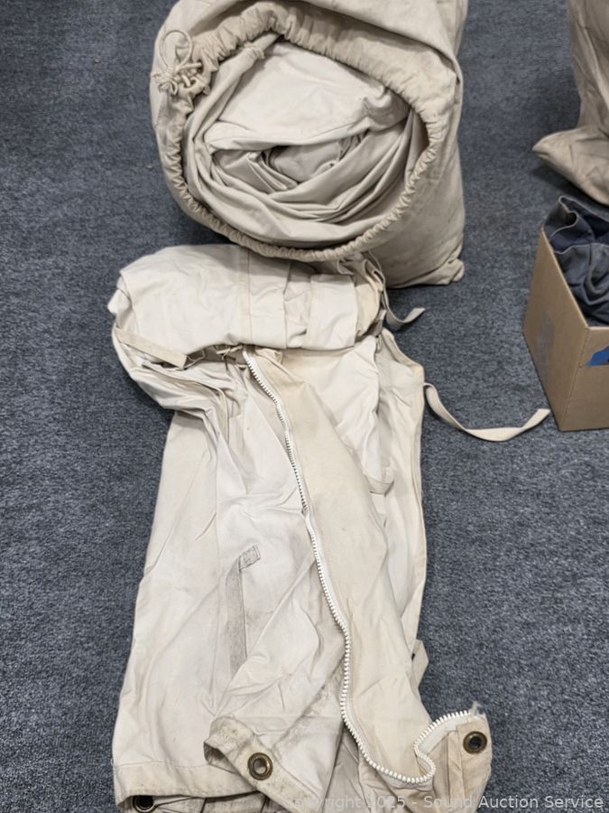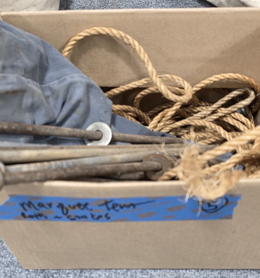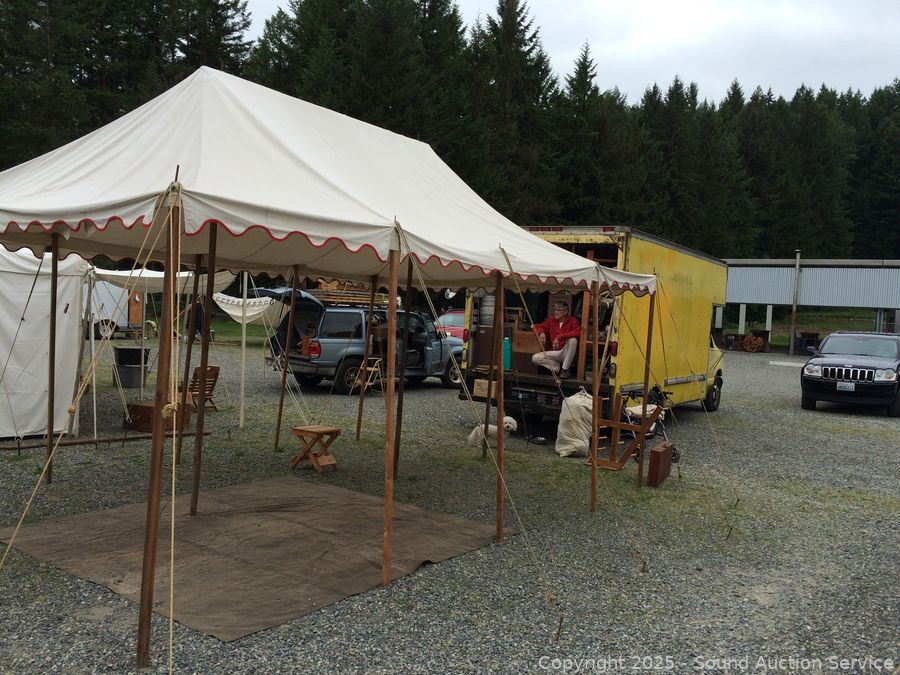 Approx. 9ft x 17ft, just a guess from the pic consignor sent with the item. Has sides that zip on, sides not pictured in photos. 15 total poles, tent does have some dirty spots. (12) 7ft poles, (2) 10ft poles, (1) 8ft pole.