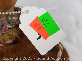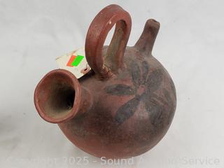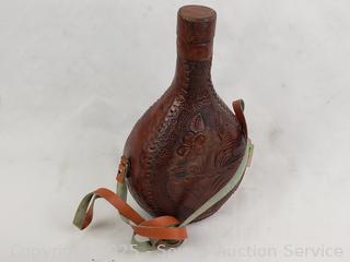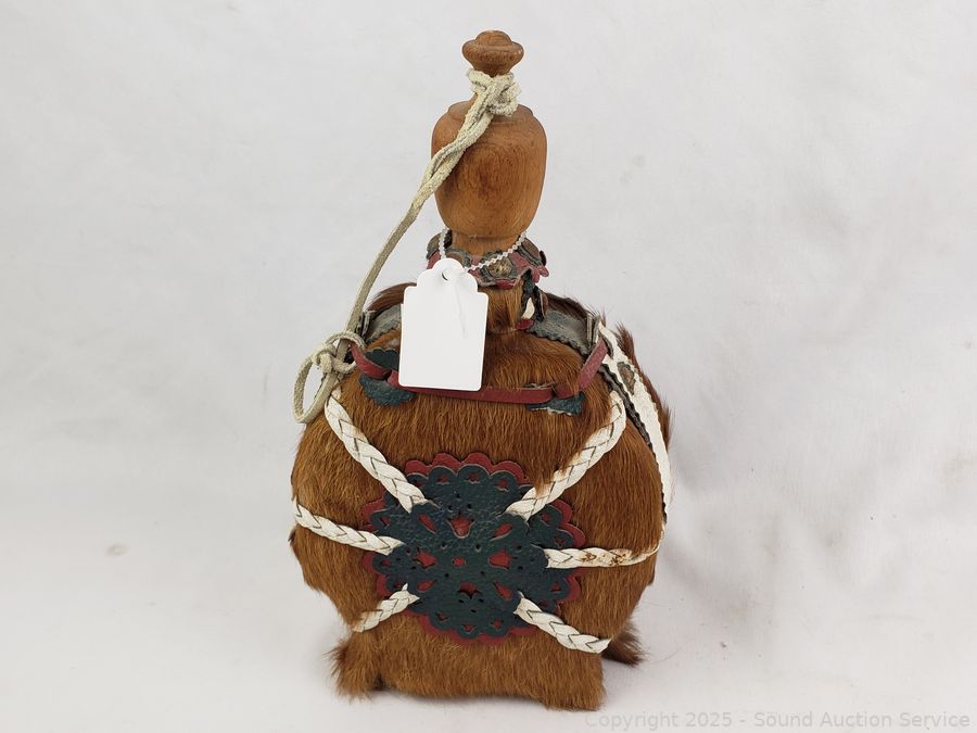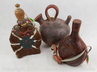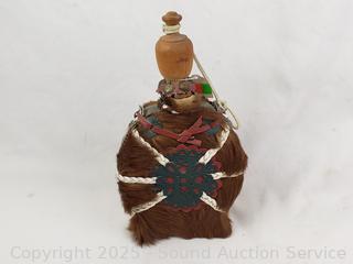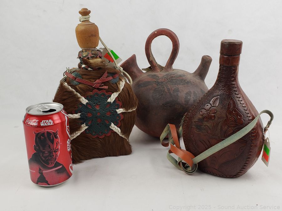 Lot #0462: Tooled Leather & Fur Wrapped Glass Bottles & Pottery Pot