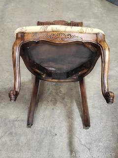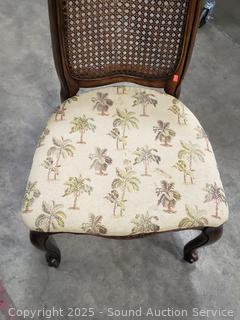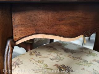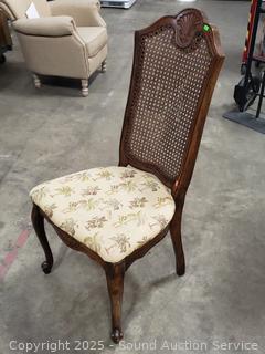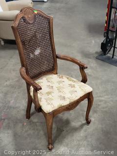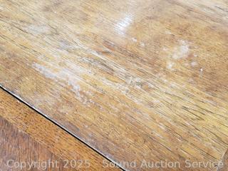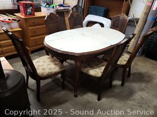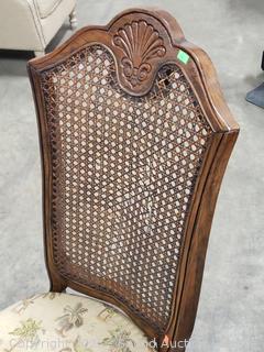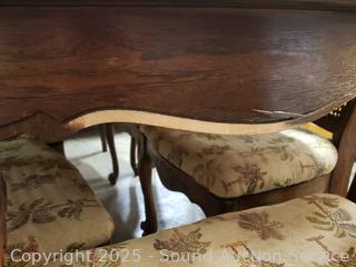 3 chairs with breaks in the cane backs. Various scuffs, wear to finish. Comes with felt tabletop protector, 30.5" H x 62" x 42.5" W with (2) 18" leaves.