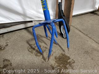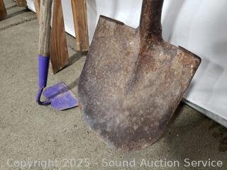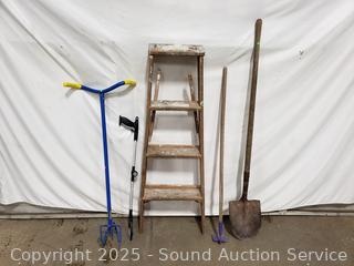 Ladder has some paint residue, wear to finish. Spade shovel, garden claw, child's hoe & grabber. Refer to photos for lot contents, more details.